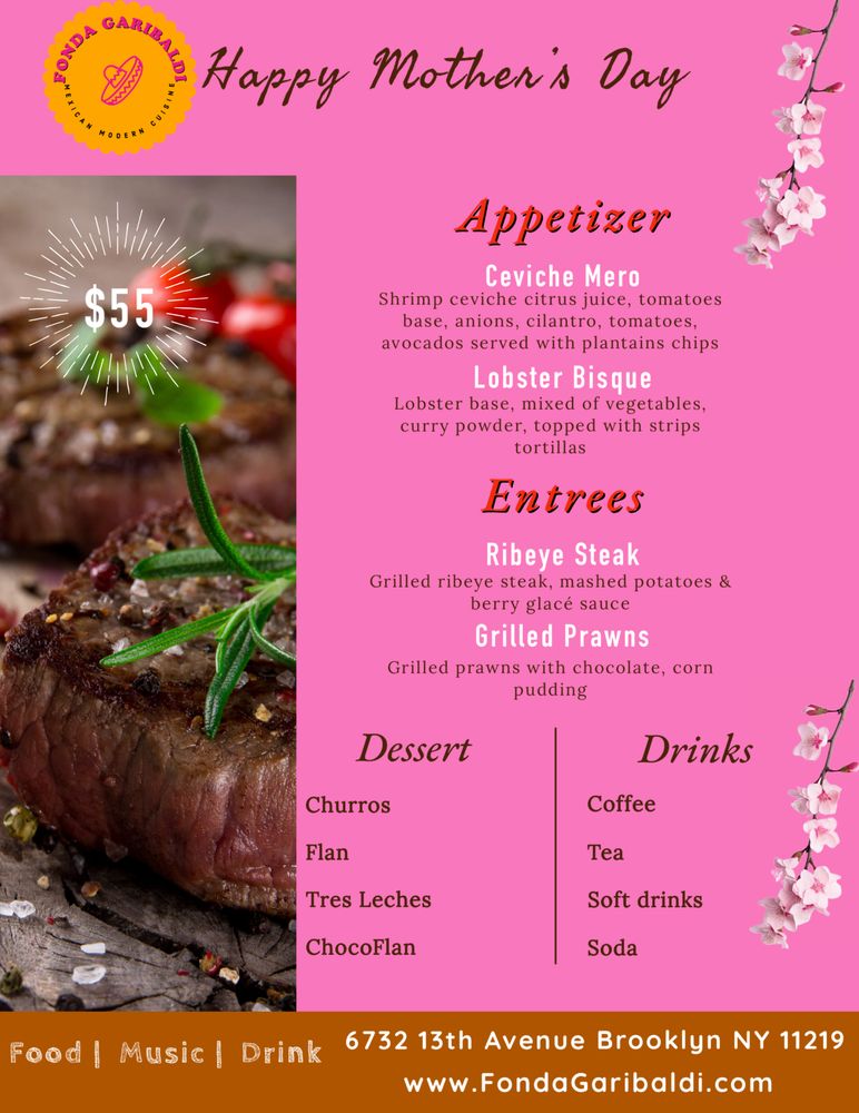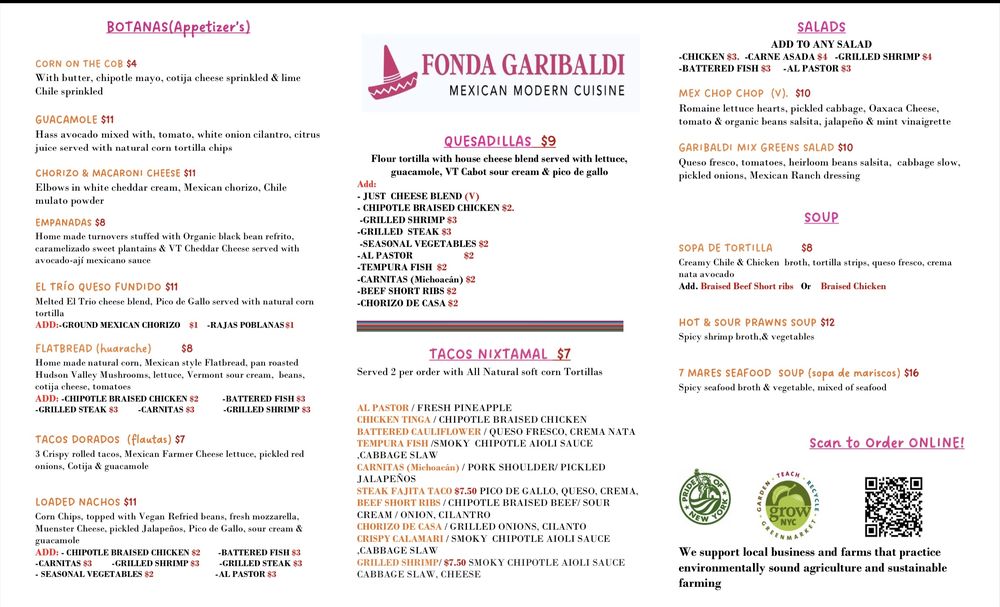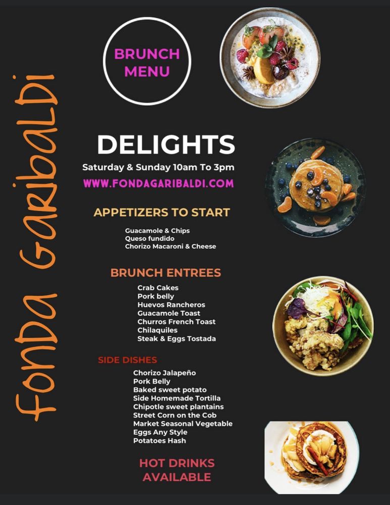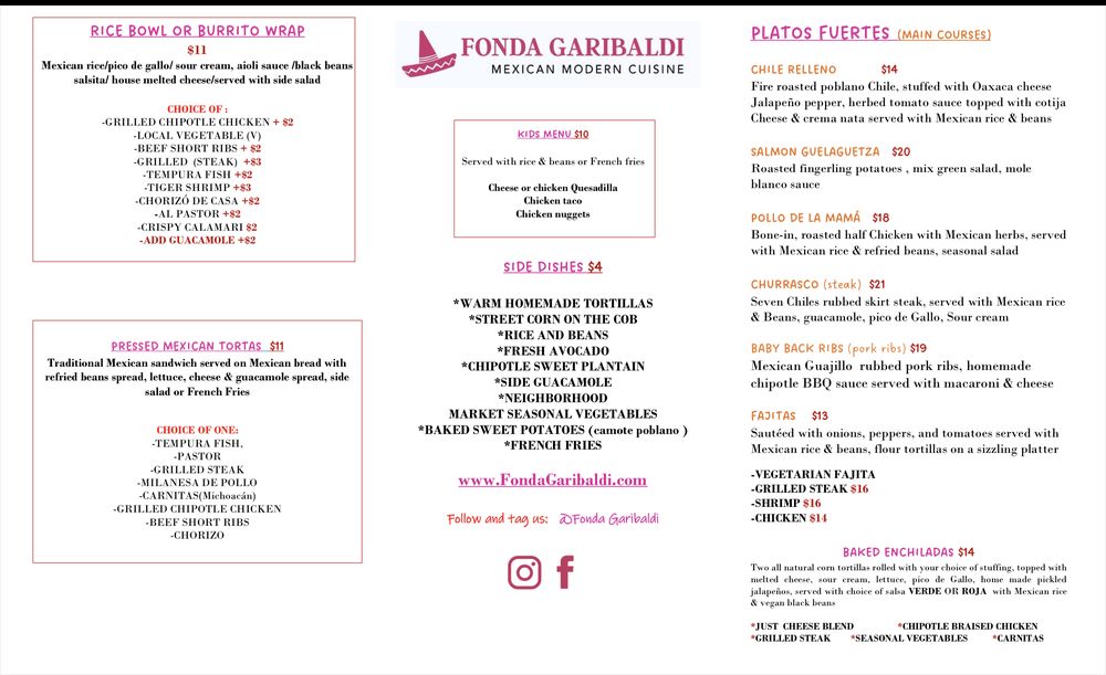 Introducing the menu at Fonda Garibaldi, a cozy Mexican restaurant located in Brooklyn, NY. Offering a range of mouth-watering dishes such as surf and turf, Pollo De La Mama, short rib tacos, and steak and eggs. Customers rave about the delicious food, impeccable service, and high-end presentation. The menu features a variety of options to satisfy all taste preferences, including fresh guacamole, homemade chips, and churros. With generous portions, reasonable prices, and plastic-free packaging options, Fonda Garibaldi ensures a memorable dining experience. Whether you're craving traditional Mexican flavors or looking to try something new, this restaurant is a must-visit for exceptional cuisine and hospitality.